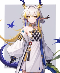 <lora:方舟黍:1:lbw=char>,1girl,shu(/arknights),horns,high quality,long sleeves,white dress,yello gloves,white coat,dragon tail,tail,jewelry,solo,, (masterpiece,best quality:1.2),absurdres, high quality,