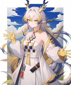 <lora:方舟黍:1:lbw=char>,1girl,shu(/arknights),horns,high quality,long sleeves,white dress,yellow gloves,white coat,dragon tail,tail,jewelry,solo,, (masterpiece,best quality:1.2),absurdres, high quality,