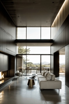 Hotel lobby, reception lobby, with a beautiful background, a sense of design, very modern, Tadao Ando,HD, with details, masterpieces, masterpiecesThere's a fireplace on the side, there's a flame