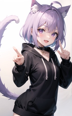 1girl, animal_ears, cat_ears, cat_tail, virtual_youtuber, nekomata_okayu, tail, hoodie, cat_girl, hood, purple_eyes, animal_ear_fluff, pointing, open_mouth, solo, ahoge, animal_collar, blush, black_hoodie, pointing_at_viewer, hair_between_eyes, looking_at_viewer, fang, white_background, :3, eyebrows_visible_through_hair, smile