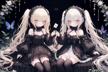bare shoulders, twintails, very long hair, thighhighs, black background, hair flower, crystal, butterfly, rose, white hair, lace gloves, star, card