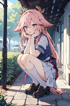 1girl, full body,school_uniform,wetting,white socks,squatting