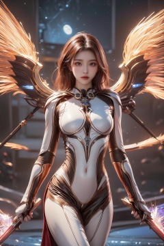 jiqing,1girl,medium breasts,weapon,wings,holding weapon,lips,bodysuit,covered navel,skin tight,science fiction,dual wielding,mechanical wings