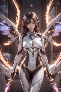 jiqing,1girl,medium breasts,weapon,wings,holding weapon,lips,bodysuit,covered navel,skin tight,science fiction,dual wielding,mechanical wings