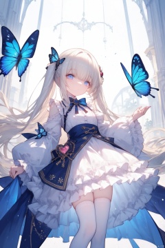 (Fantasy style), long hair, frilled dress, wide shot, loli, white pantyhose,  heart, butterfly,