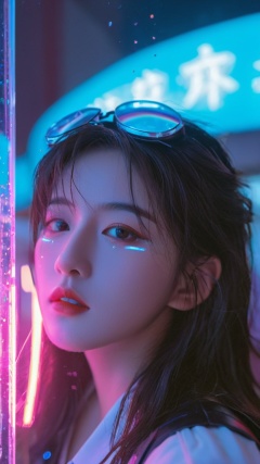 Cyberpunk,1girl,cyberpunk,neon lights,(Realistic),masterpiece,best quality,cinematic lighting,natural shadow,highest detail,professional photography,detailed background,depth of field,insane details,intricate,aesthetic,subsurface scattering,dynamic angle,Glass lenses for optical lenses,1 girl tifa_lockhart, reflected from the glass lens in the structure of the (optical:1.2) lens,