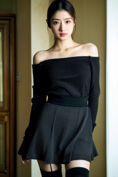 8k,RAW photo,best quality,masterpiece,realistic,1girl,off-shoulder dress,black thighhighs,sexy,hwgirl,<lora:Hwgirl_V05:0.9>,