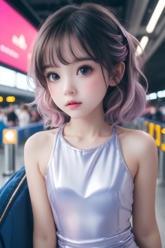 rich colors,(upper body:1.2),high gloss,extremely beautiful skin,natural skin texture,(pale skin, real_skin),(Milky skin:1.2),(shiny skin:1.4),cinematic light,fantasy,highres,highest quallity,Short pink and white hair held,eyes with light,model pose,Stiletto Boots,professional lighting,large aperturing,atmosphere,candid shots,neon lighting,hologram dress with blue and purple fabric,transparent/translucent medium,photorealistic,(airport:1.2),(child:1.6),(little girl:1.7),(cute kid:1.5),(8yo:1.5),