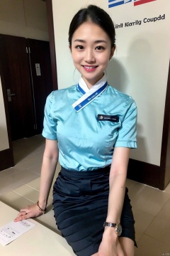 1girl, solo, looking at viewer, smile, skirt, shirt, black hair, sitting, teeth, cup, blue shirt, watch, realistic, wristwatch, id card, real life insert
