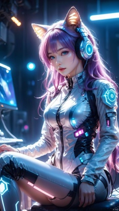 Optical particle,1girl,Future style gel coat,Future Combat Suit,animal ears,bodysuit,breasts,cat ear headphones,computer,hand on headphones,Glowing Clothing,Future Technology Space Station,full body,Sitting posture,Clothing with multiple light sources,headphones,headset,laptop,long hair,looking at viewer,motor vehicle,robot ears,science fiction,sitting,solo,Purple hair, glow, BY MOONCRYPTOWOW,(holographic projection), (cyberpunk style), (mechanical modular background), (Luminous circuit) (Flashing neon light) (Blue illuminated background) (Background blurring treatment), Light-electric style,shining,