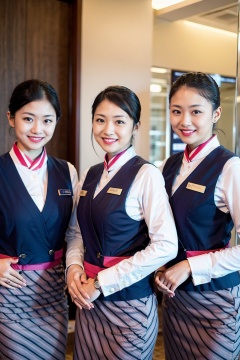 looking at viewer, smile, multiple girls, skirt, shirt, black hair, long sleeves, brown eyes, jewelry, sitting, white shirt, striped, pants, indoors, 3girls, grin, uniform, black eyes, vest, blue skirt, ring, own hands together, lipstick, watch, realistic, wristwatch, blue vest, striped skirt, vertical-striped skirt