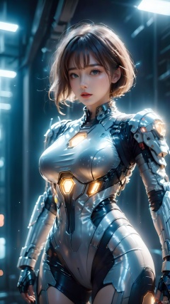 1girl,Future style gel coat,Future Combat Suit,bodysuit,breasts,Above the knee,Upper body,Grey gel coat,mecha,medium breasts,realistic,science fiction,short hair,solo,standing, glow,Optical particle,Hazy light,Optical particle,High brightness contrast, 1girl,Hazy light,Future Combat Suit,Floodlight