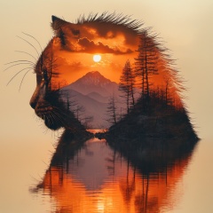 <lora:jianying01-双影:0.8>,jianying01, no humans, tree, sunset, cloud, outdoors, scenery, water, nature, reflection, mountain, orange sky