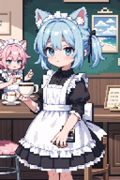 (masterpiece), (2girls), cafe, maid, cat ears, pixels, pixel arts, chibi