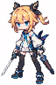 (masterpiece), pixels, pixel arts, chibi, (1girls), white background, weapon
