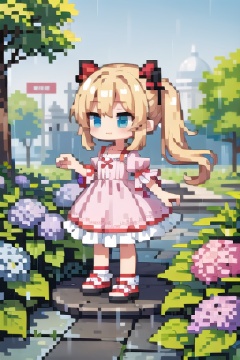 (masterpiece), pixels, pixel arts, chibi, (1girls), hydrangea, rain