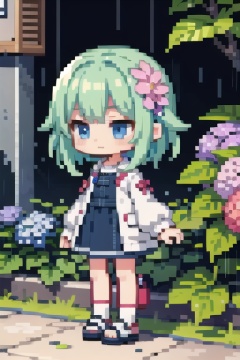 (masterpiece), pixels, pixel arts, chibi, solo, (1girls), hydrangea, rain