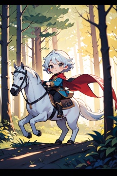 chibi,The prince is riding a white horse galloping through the forest at night,short hair,,cinematic photo,4k,highly detailed,uhd image,intricate details,,detailed scene background,detailed,8k,