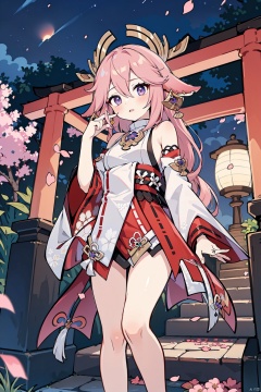 1girl, yae miko, solo, purple eyes, looking at viewer, lantern, cherry blossoms, night, holding, petals, bare legs, tree, outdoors, feet out of frame, yaemiko's-instruction outfit, torii, purple trees, hair ornament, earrings