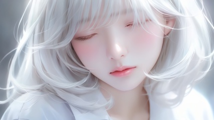 1girl, lips, realistic, solo,Silver white hair, white shirt, slightly rosy face,open your eyes