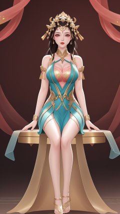 (1girl),smooth chin,masterpiece,detailed face,((hair ornament:1.2)),top quality,4k,make up,best quality,large breasts,(looking at viewer),red ribbon,dress,arms behind back,shawl,detached sleeves,forehead mark,golden hair ornament,<lora:王者杨玉环原皮_v1.1:0.7>,legs,on street,full body,sitting on table,