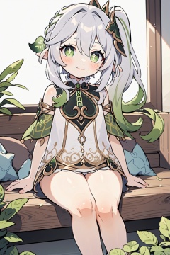 1girl, solo, smile, looking at viewer, nahida, sitting, toes, blush, thighs, legs, for-all-knowledge-a-verse outfit