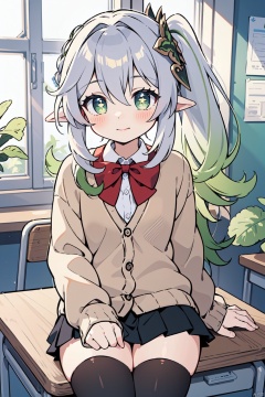 1girl, solo, skirt, grey cardigan, desk, black skirt, looking at viewer, thighhighs, bow, school uniform, pleated skirt, sitting, black thighhighs, bowtie, long sleeves, red bow, indoors, contemporary, cardigan, red bowtie, blush, shirt, sleeves past wrists, closed mouth, leaf hair ornament, window, nahida, aged up, cowboy shot, breasts
