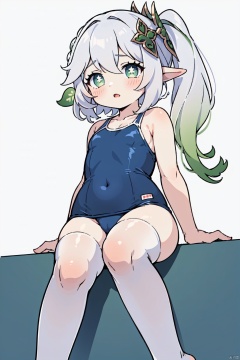 1girl, solo, thighhighs, swimsuit, no shoes, one-piece swimsuit, blue one-piece swimsuit, feet, school swimsuit, white thighhighs, white background, thighs, simple background, looking at viewer, sitting, soles, toes, parted lips, covered navel, blush, bare shoulders, knee up, nahida, from below