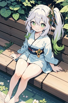 1girl, solo, kimono, japanese clothes, smile, sash, sitting, obi, yukata, toes, barefoot, feet, white kimono, legs, looking at viewer, thighs, short kimono, nahida, from above, outdoors