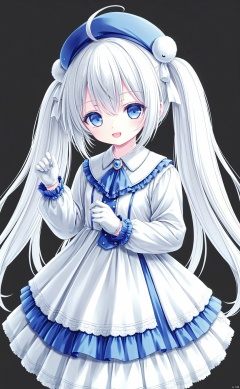 masterpiece,best quality,very long hair,cowboy shot,moinszero,moinszero,moinszero,moinszero,moinszero,moinszero,moinszero,moinszero,blue_eyes,gloves,solo,hat,open_mouth,white_background,smile,grey_gloves,white_hair,looking_at_viewer,upper_body,long_sleeves,simple_background,ascot,hair_between_eyes,ahoge,brooch,white_gloves,twintails,