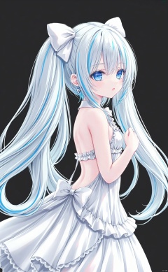 masterpiece,best quality,very long hair,cowboy shot,moinszero,moinszero,moinszero,moinszero,moinszero,moinszero,moinszero,moinszero,1girl,solo,streaked_hair,jewelry,earrings,bow,white_bow,blue_eyes,hair_bow,multicolored_hair,white_background,parted_lips,simple_background,profile,blue_hair,white_hair,upper_body,frills,bare_shoulders,twintails,