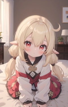 masterpiece,best quality,1girl,solo,klee \(genshin impact\),short hair,blonde hair,twintails,low twintails,hair between eyes,bangs,sidelocks,ahoge,pointy ears,red eyes,looking at viewer,indoor,bed,on bed,