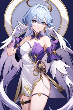 <lora:nai3画风bysdlion-000035:0:lbw=OUTALL>,thigh strap,robin,1girl,solo,bare shoulders,halo,white gloves,white dress,earrings,strapless dress,head wings,<lora:知更鸟pro】:1:lbw=char>,, (masterpiece,best quality,high quality:1.2),absurdres,