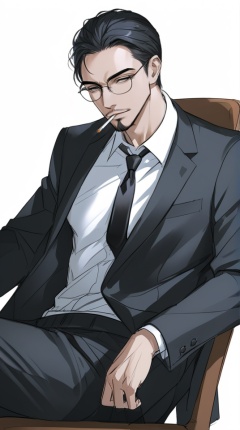 (best quality), ((masterpiece)), (highres), illustration, original, extremely detailed, <lora:男风XL:0.7>1boy, male focus, solo, necktie, cigarette, formal, sitting, black hair, suit, white background, jacket, black pants, pants, glasses, shirt, chair, facial hair, smoking, simple background, black jacket, black necktie, white shirt, short hair