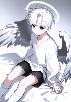 (best quality), ((masterpiece)), (highres), illustration, original, extremely detailed, <lora:男风XL:0.7>blue eyes, 1boy, solo, shorts, socks, male focus, wings, sitting, looking at viewer, angel wings, halo, long sleeves, angel, controller, shirt, game controller, no shoes, white theme, white hair, feathered wings, short hair, male child, black shorts, spot color, white shirt, white socks, bed sheet, on bed, parted lips, gamepad