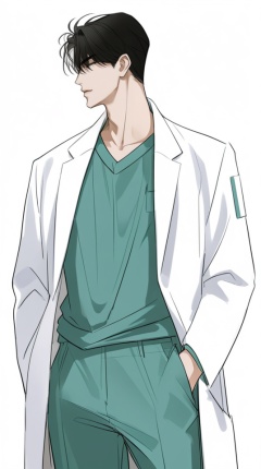 (best quality), ((masterpiece)), (highres), illustration, original, extremely detailed, <lora:男风XL:0.7>male focus, 1boy, solo, black hair, simple background, white background, short hair, hands in pockets, shirt, pants, labcoat, looking to the side, standing, closed mouth, open clothes, green shirt, cowboy shot