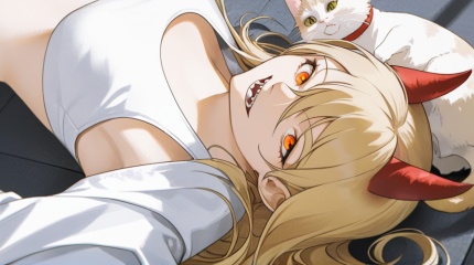 (best quality), ((masterpiece)), (highres), illustration, original, extremely detailed, <lora:男风XL:0.7>cat, power \(chainsaw man\), 1girl, horns, on back, long hair, lying, shirt, open mouth, looking at viewer, demon horns, teeth, blonde hair, white shirt, cross-shaped pupils, sharp teeth, solo, hair between eyes, white cat, red horns, upper body, animal, open clothes, smile, symbol-shaped pupils, long sleeves, breasts, crop top, orange eyes, midriff, **** top, demon girl, red eyes