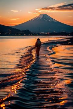 An extremely beautiful racer wearing a racing suit with sporty pants, standing next to a red Ferrari F8 Tributo 2023 Edition, in front of a beautiful lake and the bottom of Mount Fuji, rear view of the car, low-angle close-up shot, 6 PM, sunset time, beautiful gradient pink and orange sunset with fluffy clouds, shot with Sony G Master zeiss batis 18mm f/2.8, award-winning picture, highly detailed, ultra-high resolutions, 32K UHD, sharp focus, best quality, masterpiece
