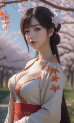 (,1girl, pov,best quality, )masterpiece, fantasy, realistic,science fiction,mole, ultra realistic 8k cg, ,tamari \(flawless\),  cleavage,large breasts ,lemon blossoms, orange blossoms, spider lily, lily \(flower\),cherry blossoms,plum blossoms, strawberry blossoms      ((()))