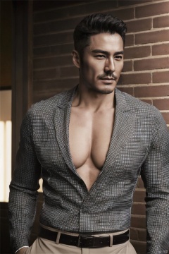jzns,hbing,1man,male focus,asian,40 y.o,exquisite facial features,handsome,fashion forward,unbuttoned black mesh shirt,(pubic hair,chest hair),pectoralis,cleavage cutout,masterpiece,realistic,best quality,highly detailed,cowboy_shot