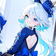 ((masterpiece,best quality)), highres, 1girl, furina, heterochromia, blue hat, tears in eyes, smile, long sleeves, looking back,