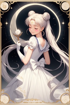 1girl,crescent,double_bun,facial_mark,twintails,tsukino_usagi,crescent_facial_mark,dress,sailor_senshi_uniform,jewelry,bow,white_dress,earrings,forehead_mark,framed,white_gloves,solo,princess_serenity,white_hair,closed_eyes,hairpin,smile,very_long_hair,back_bow,moon,magical_girl,own_hands_clasped
