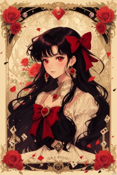 red_flower,red_rose,rose,sparkle,star_\(symbol\),flower,pink_rose,1girl,earrings,white_rose,card_\(medium\),star_earrings,thorns,rose_petals,tarot,jewelry,solo,art_nouveau,black_hair,pink_flower,bow,roman_numeral,yellow_rose,framed,cross,red_bow,purple_rose,hair_bow,rose_print,red_eyes