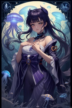 Best quality, stunning, beautiful golden eyes, fine details, depth of field, extremely detailed CG Unity 8k wallpaper, (1 girl: 1.5), deep sea background, jellyfish, colorful jellyfish, masterpiece, fluttering detailed splash, beautiful detailed water, eye of the universe, shock, (tarot), octopus, original,,, Raiden_shogun is pulling a blade from her chest,,,