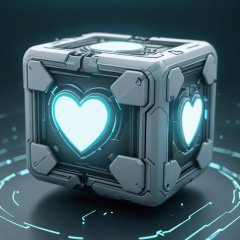 scifi, glowing, neotech, weighted_companion_cube, cyan glowing heart symbol, blurry_background,  , hyper detailed