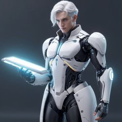scifi, glowing, neotech, scholar , holding a device , 1man, white hair, glowing eyes, short hair,full_body, blurry_background, , hyper detailed