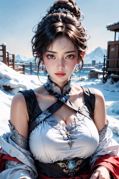 Best quality,  ultra-high resolution,  (photo realism: 1.4),  1 girl,  (shoulder length shirt: 1.2),  embroidered lace craftsmanship,  red and black,  enticing posture,  separated sleeves,  snowy mountain background,  plump,  big breasts,  messy bun,  looking at the audience,  gentle lighting,<lora:EMS-260325-EMS:0.600000>