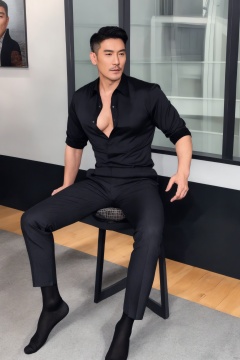 jzns,hbing,1man,fashion model,male focus,asian,40 y.o,exquisite facial features,handsome,fashion forward,unbuttoned black mesh shirt,(pubic hair,chest hair),pectoralis,cleavage cutout,shirt,pants,sheer socks,footwear,masterpiece,realistic,best quality,highly detailed, jzns