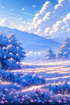 outdoors, scenery, no humans, day, sky, cloud, grass, flower, mountain, field, water, tree, landscape, blue sky, river, pink flower, nature, lake, cloudy sky<lora:Flower field_20230729165144:0.78>