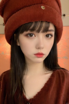 masterpiece, best quality, 1girl, red background, black hair, Long curly hair, face front, ((red fashion silk lone costume with red swirling vortexes pattern)), ((Red Plush Fur Hat)), emotional face, (close up portrait), make up, studio light, studio, ((poakl)), poakl ggll girl